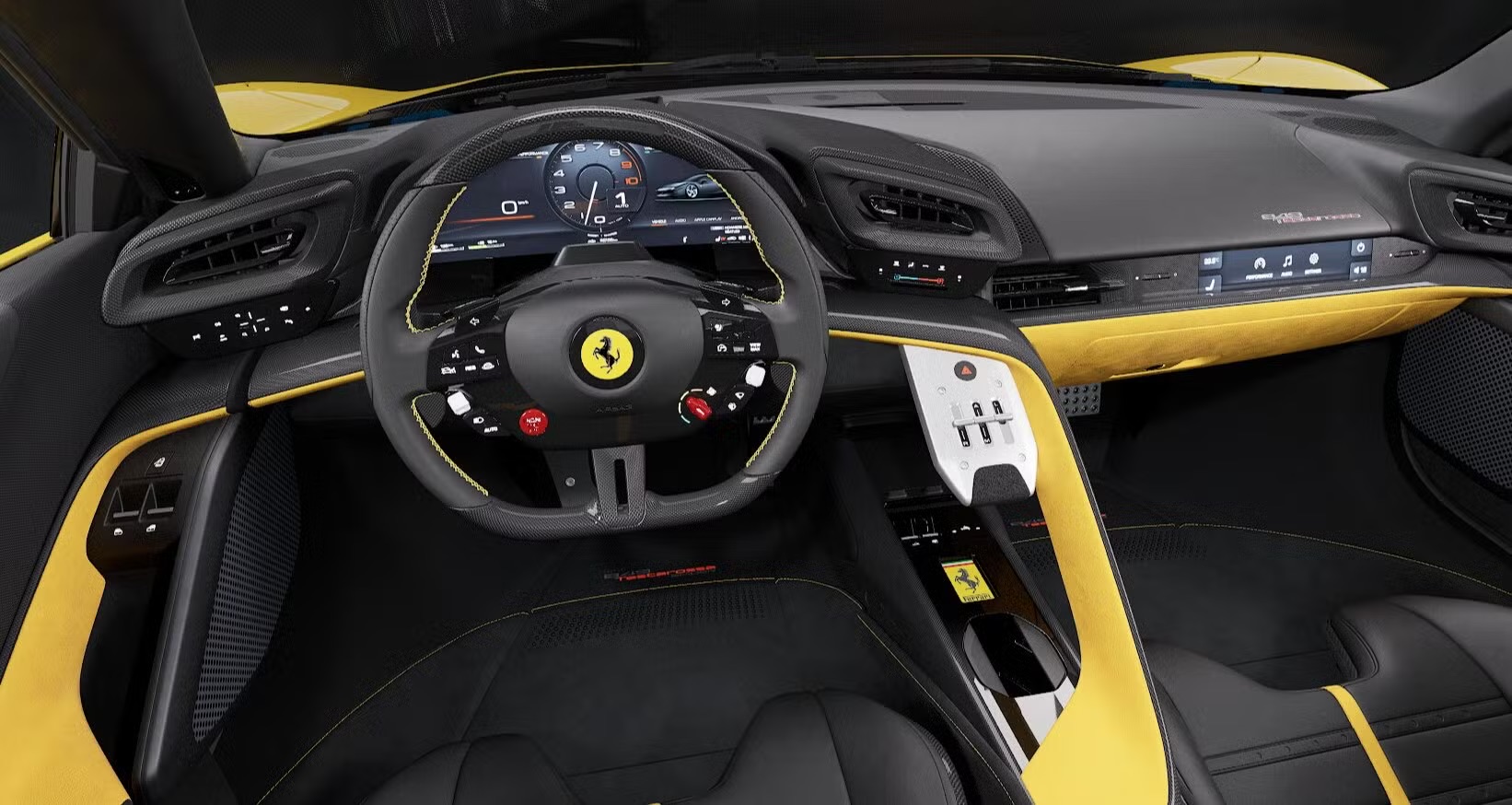 Inside, the cabin blends Nero Alcantara surfaces with contrasting technical details inspired by Ferrari’s bespoke Tailor Made department. The two-seat configuration prioritises ergonomics and refinement: sculpted bucket seats, digital instrumentation inspired by the SF90 series, and minimalist control surfaces. Every element serves performance and elegance in equal measure.