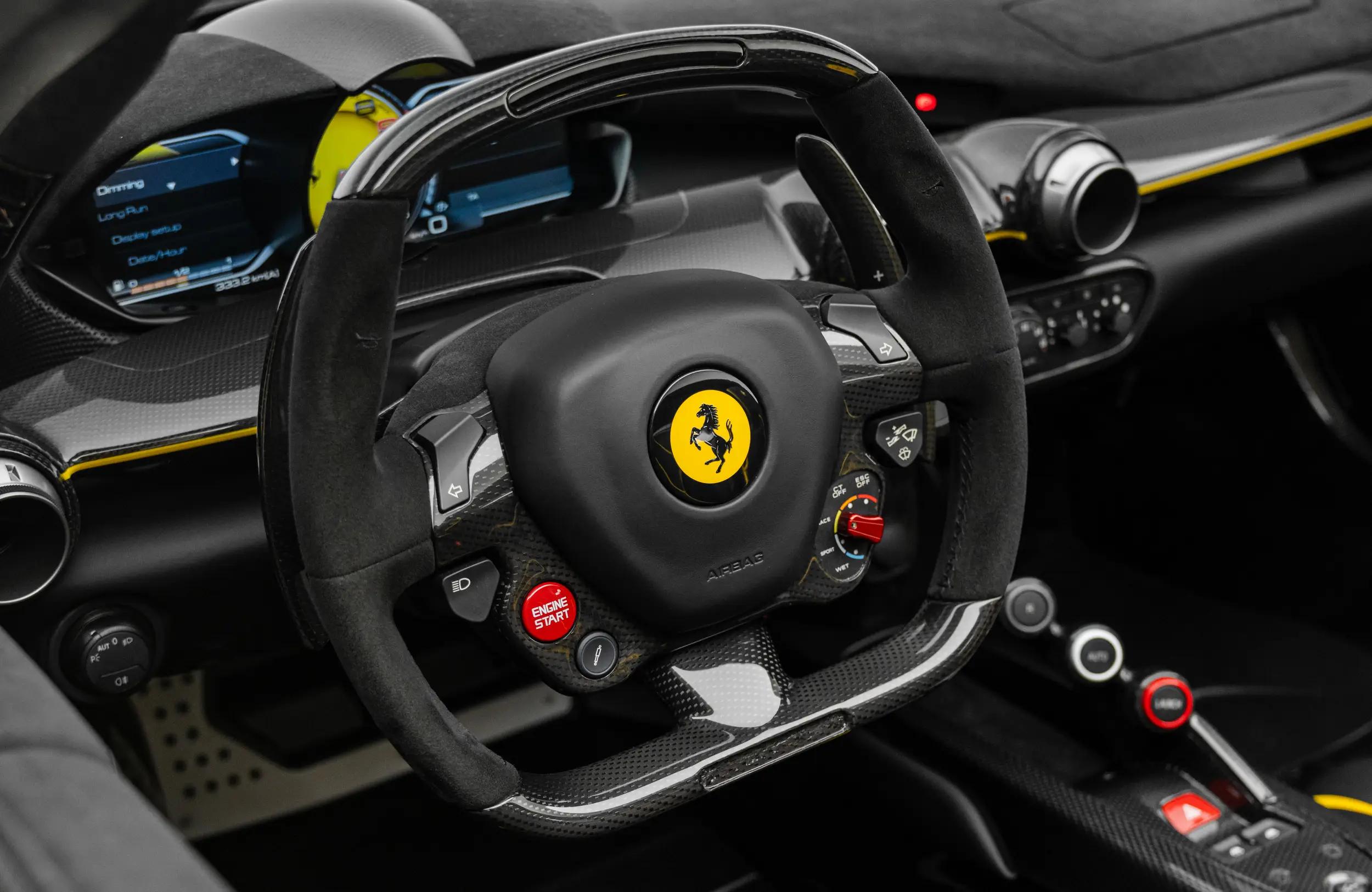 Inside, the black leather interior balances minimalist architecture with fine materials and ergonomic precision. Every surface reflects Ferrari’s focus on both craftsmanship and performance efficiency. The cabin, though stripped of unnecessary ornamentation, maintains an atmosphere of exclusivity and clarity, placing the driver at the centre of an analogue-digital symbiosis.