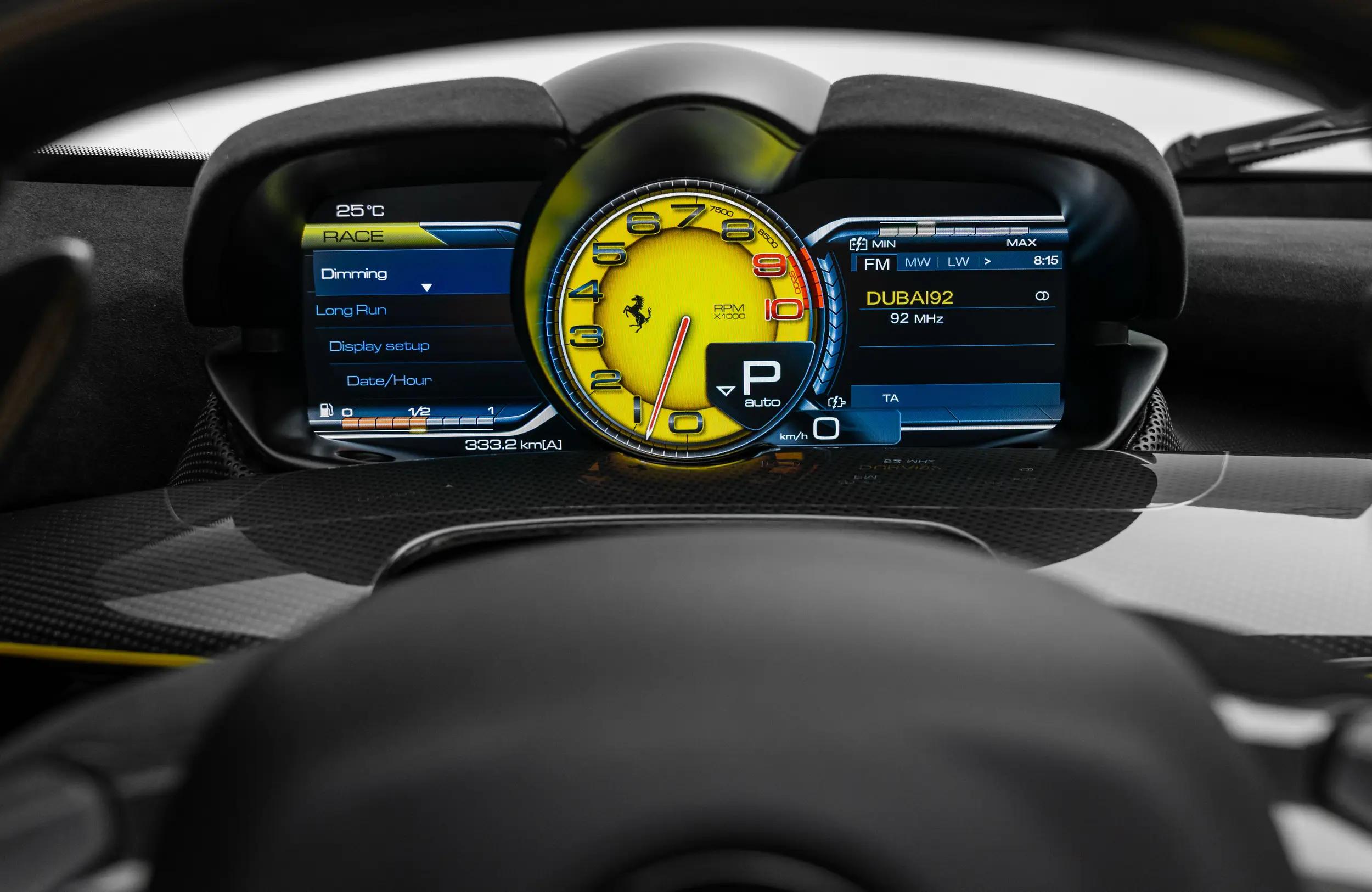 At its core lies a 6.3-litre V12 naturally aspirated engine paired with an electric motor, producing a combined 963 horsepower and 900 Nm of torque. The hybrid configuration was engineered under Ferrari’s HY-KERS system, ensuring instant torque response and maintaining linear power delivery across all rev ranges. Power is channelled through a 7-speed dual-clutch transmission to the rear wheels, allowing the car to reach 100 km/h in approximately 2.8 seconds, before continuing toward a top speed of 350 km/h.