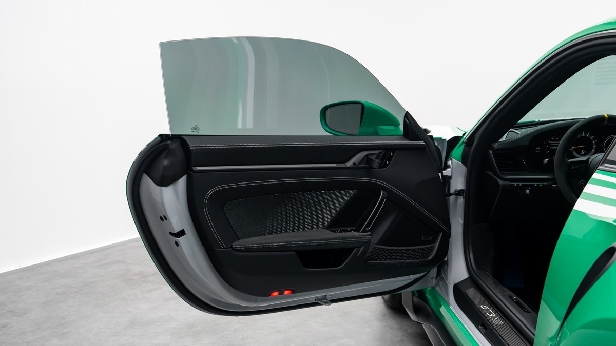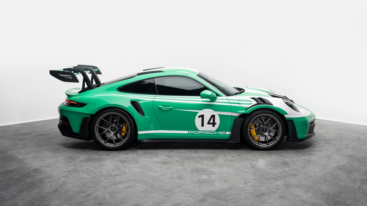 Its exterior features a bespoke complete wrapping in Green and White, applied by Porsche Exclusive Manufaktur to accentuate the GT3 RS’s aerodynamic surfaces. The combination of sculpted intakes, functional vents, and the Weissach-package aero profile creates a visually dramatic and technically advanced presence. The 20-/21-inch forged magnesium wheels, finished in Satin Darksilver, combine aesthetic restraint with minimal unsprung weight.