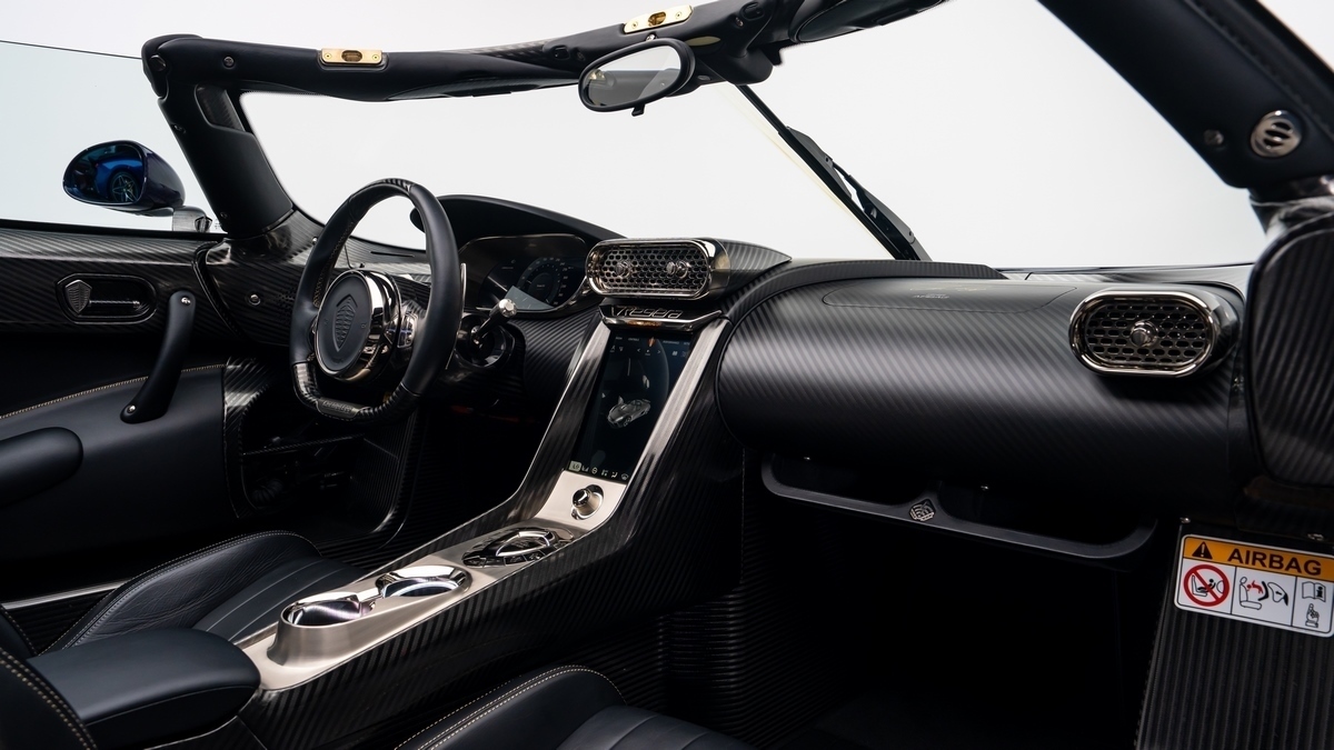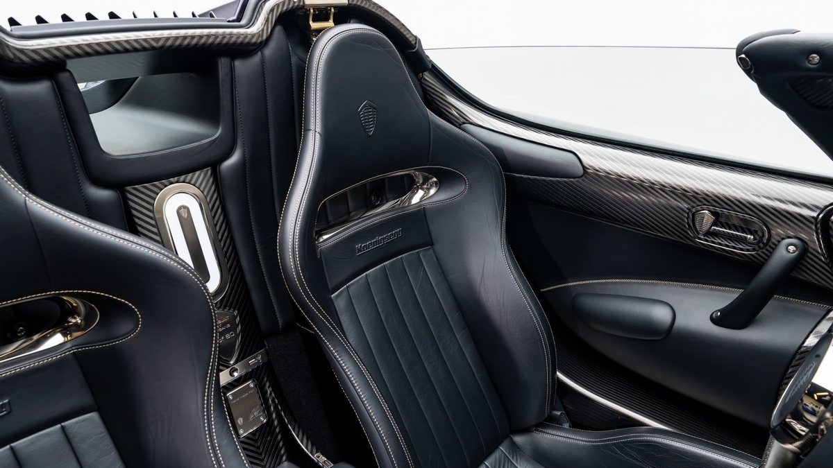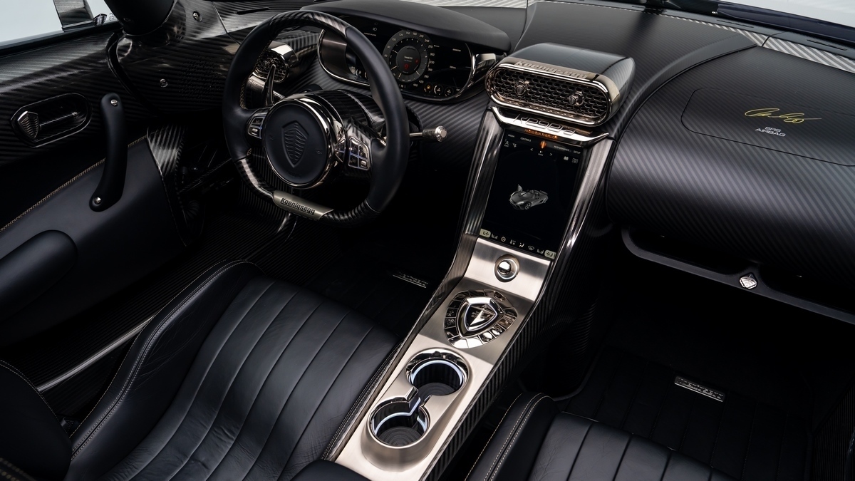 Inside, the Regera presents an equally tailored environment. The cabin features Desiato leather in dual tones — Desiato and Desiato Black — extending across the dashboard, steering wheel, and door panels. Intricate French cross stitching in gold thread complements the exterior accents. The use of carbon fibre throughout the dashboard, demister surrounds, and central fascia maintains visual continuity between structure and design. Polished aluminium switchgear, black anodized hardware, and a leather-lined luggage compartment exemplify the attention to tactile and aesthetic detail characteristic of Koenigsegg’s bespoke builds.