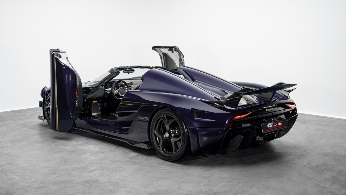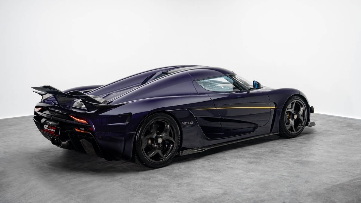 The Koenigsegg Regera 2019, available through Alain Class Motors in Dubai, is an ultra-rare Euro-specification hypercar that seamlessly merges mechanical innovation with handcrafted exclusivity. Showing only 598 kilometres, this example combines Koenigsegg’s pioneering hybrid engineering with a bespoke specification finished in purple-tinted carbon fibre and gold leaf detailing — a combination rarely seen, even among the Regera’s limited production.