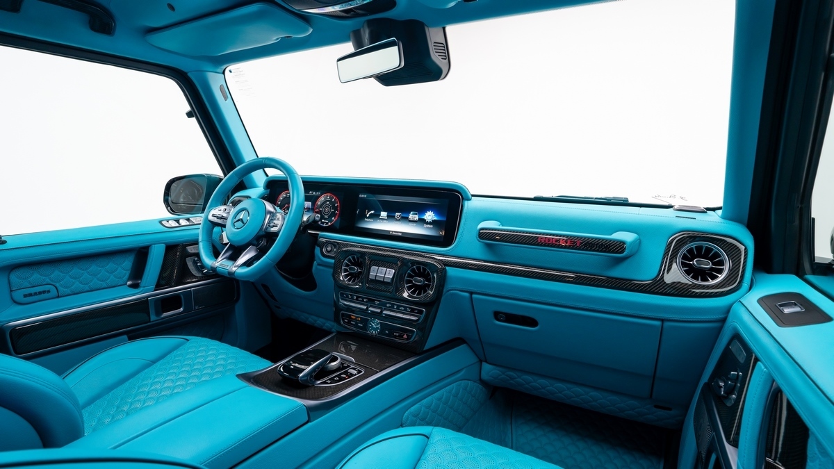 Inside, the cabin introduces an unexpected contrast — a fully bespoke blue leather interior, tailored by BRABUS Masterpiece artisans. The quilted diamond stitching, carbon-fibre inlays, and aluminium detailing exemplify the studio’s commitment to perfection. Each panel is handcrafted, from the perforated seats to the embossed BRABUS insignias and illuminated door sills. The tactile experience is complemented by advanced comfort features, including multi-zone climate control, ambient lighting, and high-grade sound integration, creating a balance between comfort and technical sophistication.