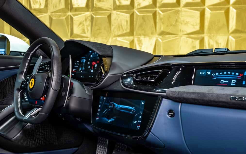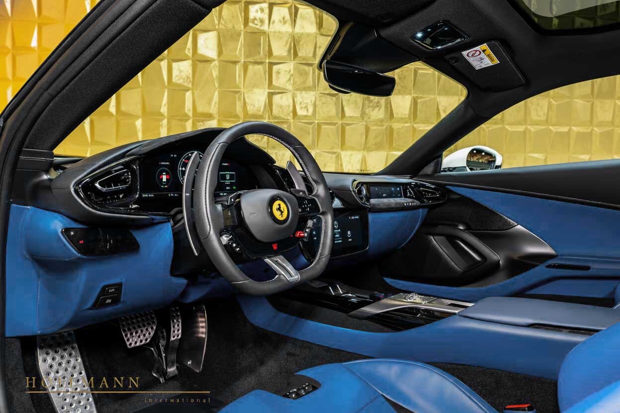 Inside, the cabin features a breathtakingly high-contrast and personalized environment. The leather upholstery is finished in striking Azzurro Santorini (Blue), a vibrant hue that transforms the interior into a bespoke, exotic sanctuary. This dramatic color selection confirms the vehicle was ordered with an extensive Personalization package (PPAC). The primary dashboard (DSH7) is finished in complementary Black leather for optimal visual focus. Further elevating the environment is the full Panoramic Roof (ECRF), which floods the cockpit with natural light, enhancing the perception of luxury and space for both occupants.