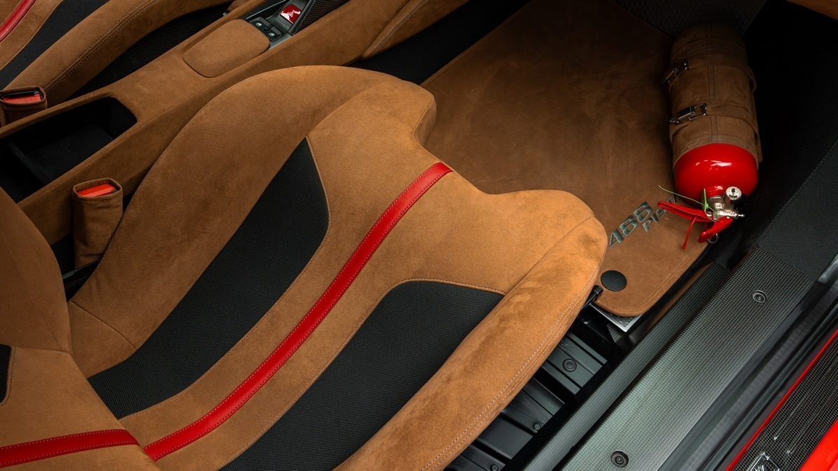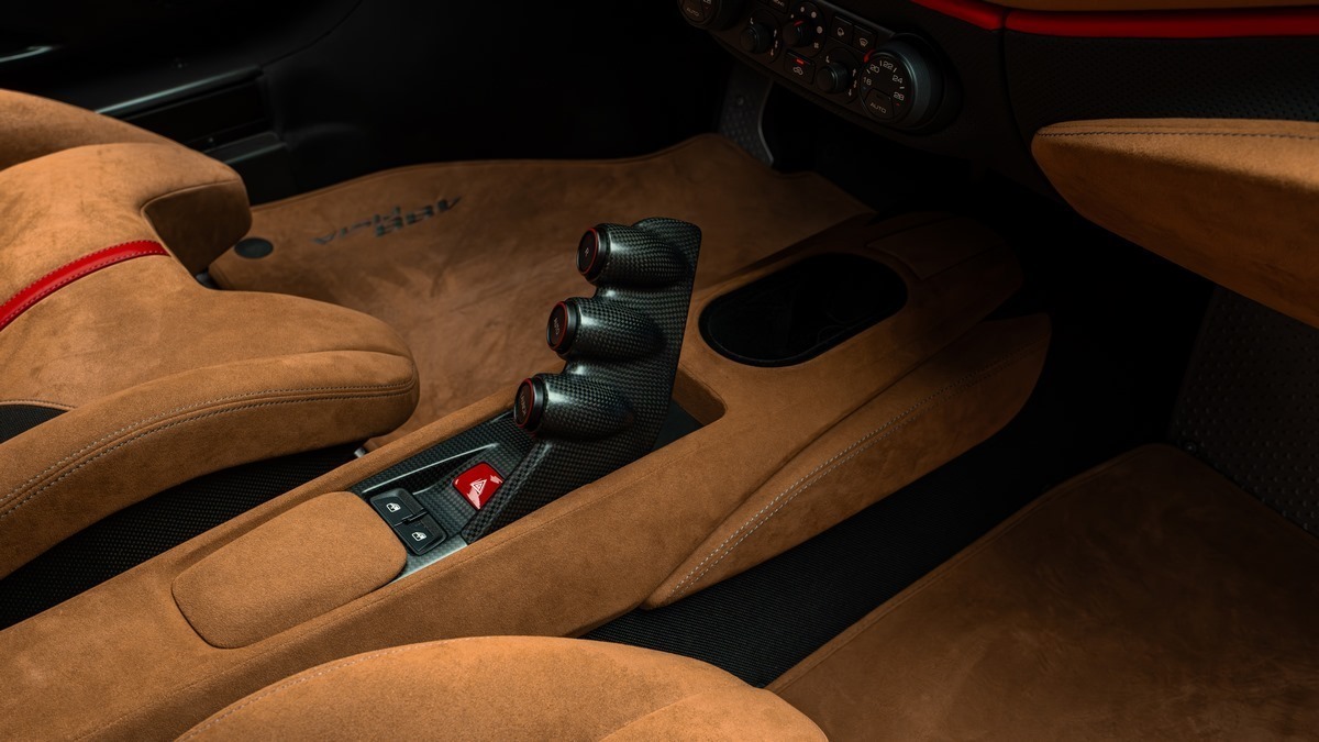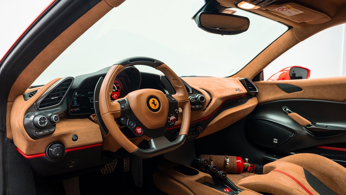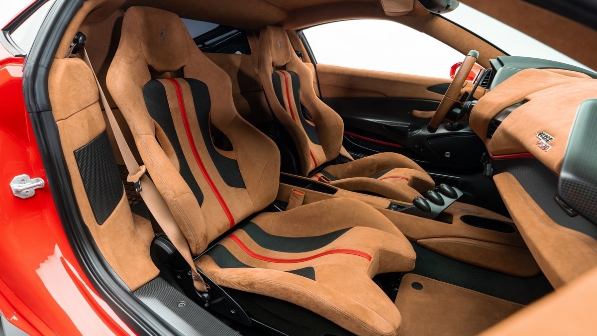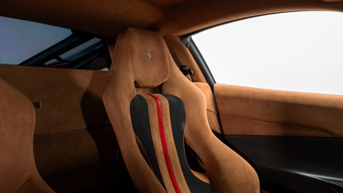 Inside, the cabin is trimmed in Cuoio Alcantara, reinforcing the model’s lightweight philosophy. Carbon fibre racing seats are fitted, complemented by a simplified interior architecture focused on driver engagement and feedback. Surfaces and controls are arranged around ergonomics and visibility, prioritising function over comfort features not aligned with the car’s purpose. The interior configuration reflects Ferrari’s approach to its track-oriented derivatives, where material choice and layout directly support performance objectives.