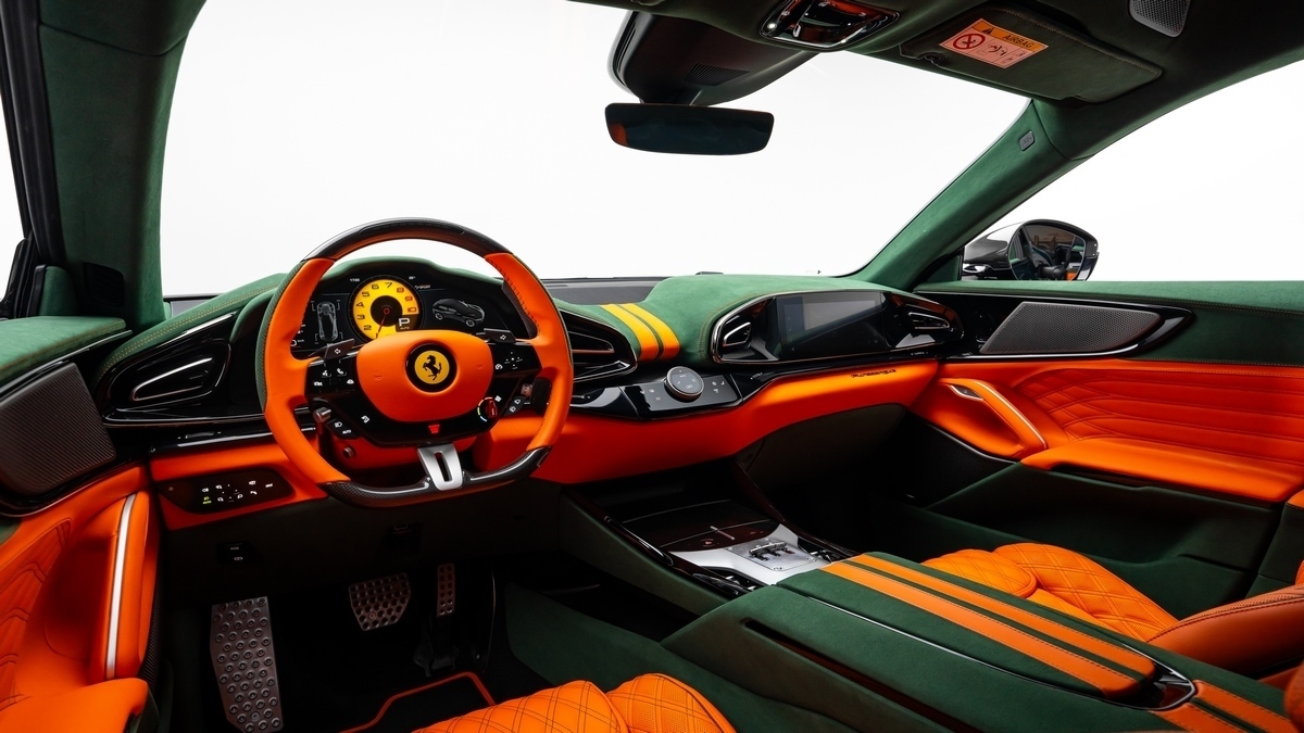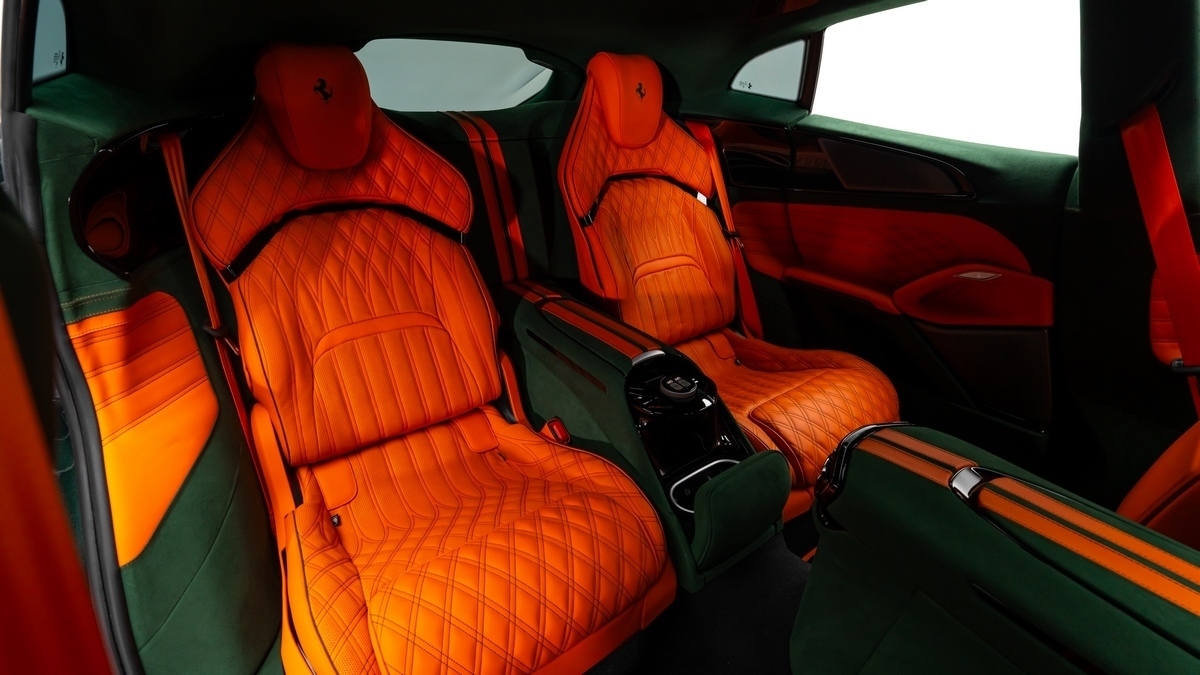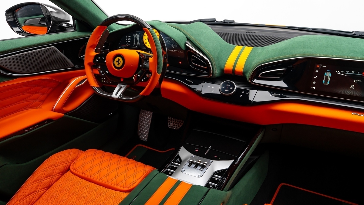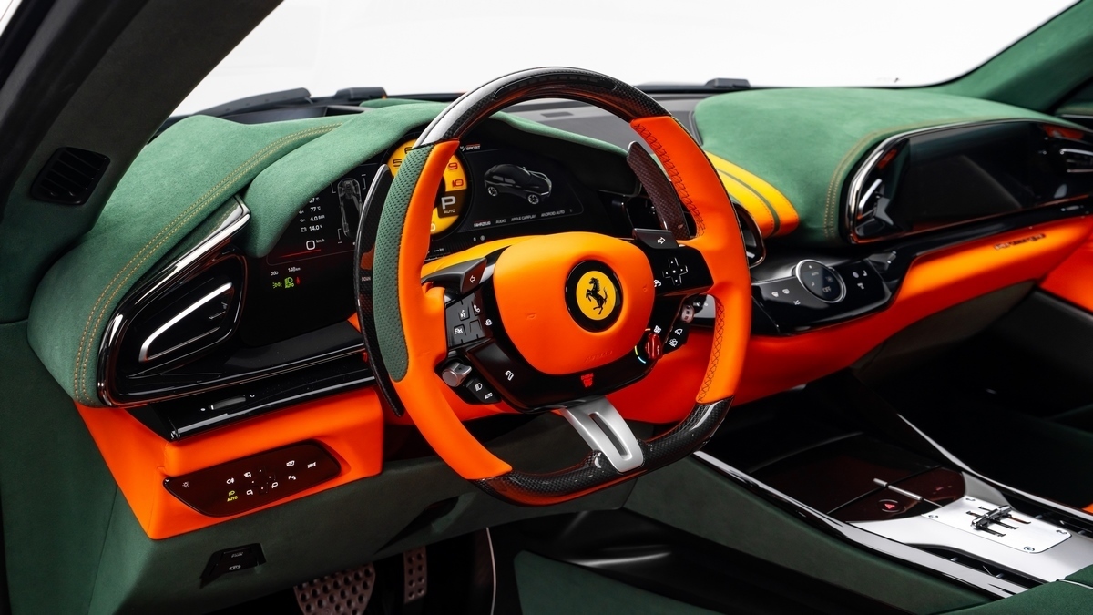 Inside, the Purosangue departs from Ferrari’s standard interior palette. The cabin is trimmed in NOVITEC Arancio leather combined with Verde Alcantara, extending across seats, dashboard elements, and detailing. This interior treatment aligns deliberately with the exterior theme rather than acting as a neutral counterpoint. It reinforces the car’s identity as a commissioned build rather than a configurator-driven example.