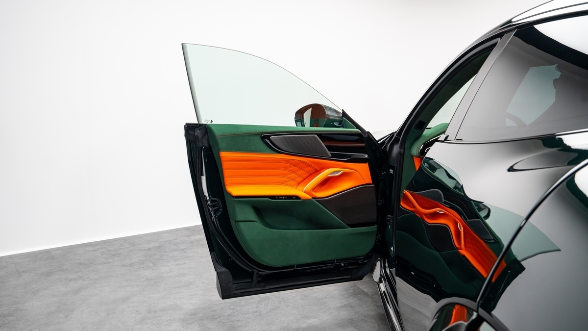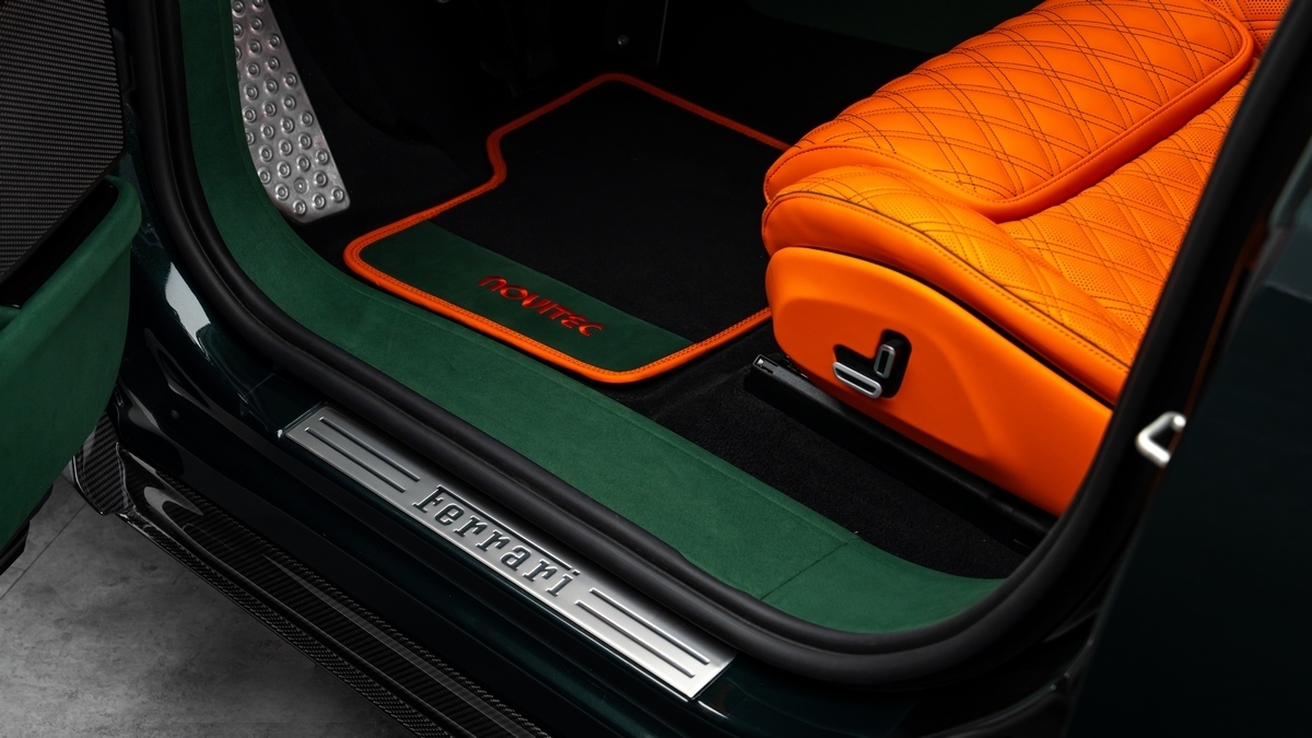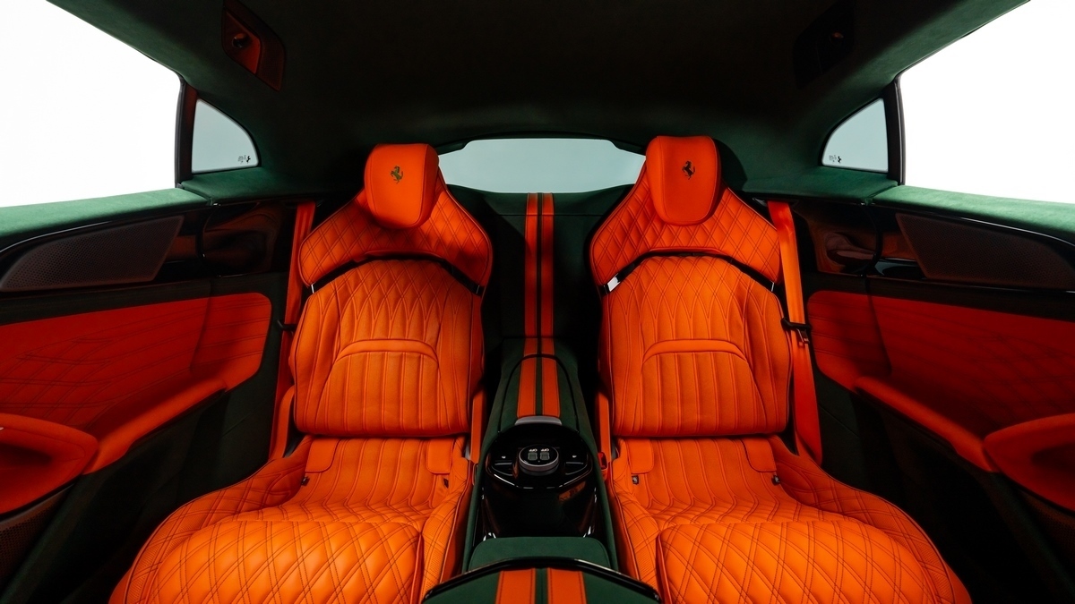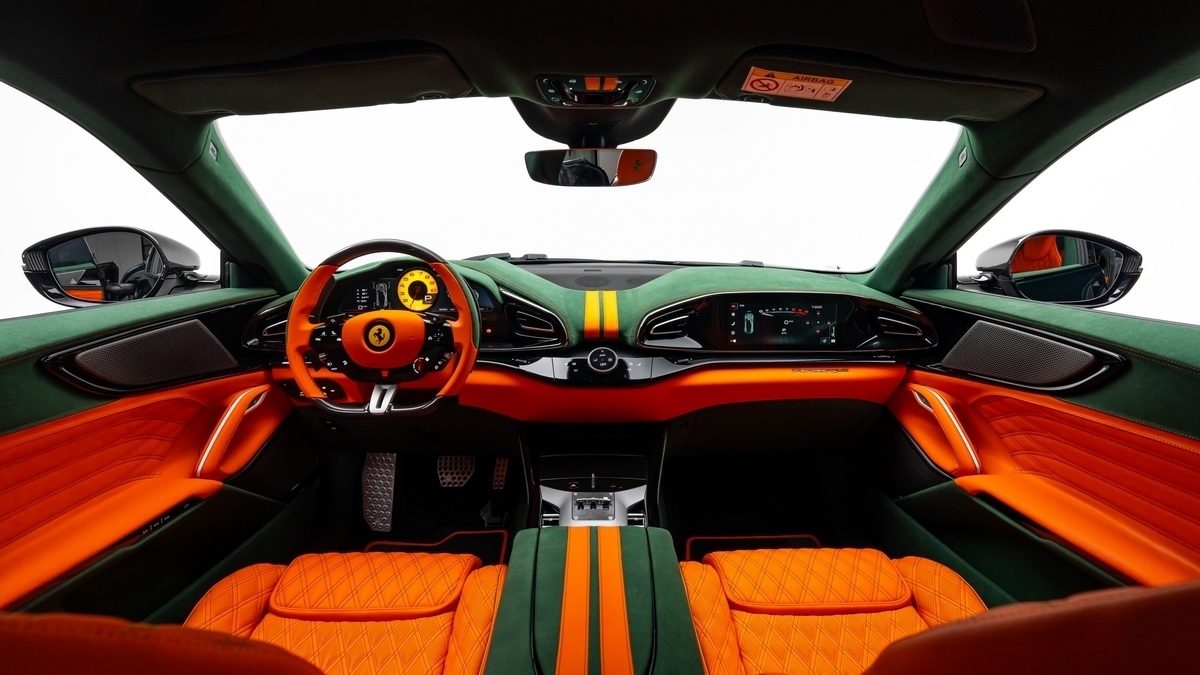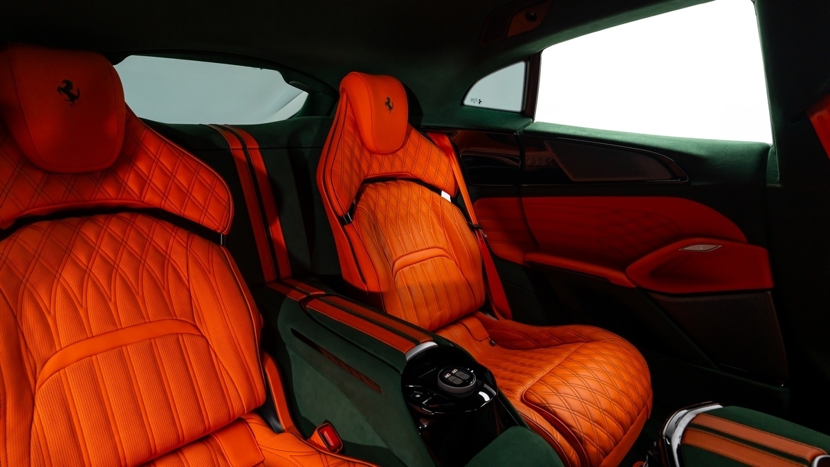 Inside, the Purosangue departs from Ferrari’s standard interior palette. The cabin is trimmed in NOVITEC Arancio leather combined with Verde Alcantara, extending across seats, dashboard elements, and detailing. This interior treatment aligns deliberately with the exterior theme rather than acting as a neutral counterpoint. It reinforces the car’s identity as a commissioned build rather than a configurator-driven example.