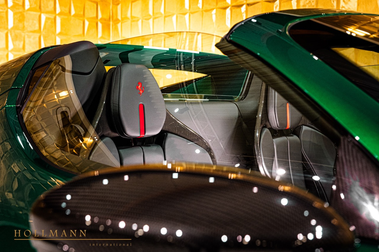 The exterior identity is defined first by colour, then by geometry. The body is finished in NOVITEC Verde Montreal with a Bianco Cervino stripe, a combination that reads clean at distance and still holds definition along the sculpted surfaces of the 296. The N-Largo transformation changes the stance and the visual footprint, shifting the car from compact mid-engine proportions toward a wider, more planted silhouette. The listing specifies the NOVITEC N-LARGO widebody kit, supported by multiple visible-carbon elements: the N-Largo trunk in visible carbon, the diffuser in visible carbon, and Novitec optional visible carbon fibre finishing. Aerodynamic additions are named individually, including the N-Largo ducktail and a rear spoiler, plus dedicated N-Largo mirrors and a triangle cover for the side windows. The details stay consistent, down to black reflectors and a carbon cover for the rear-view camera, so the conversion reads as a complete exterior package rather than a partial overlay.