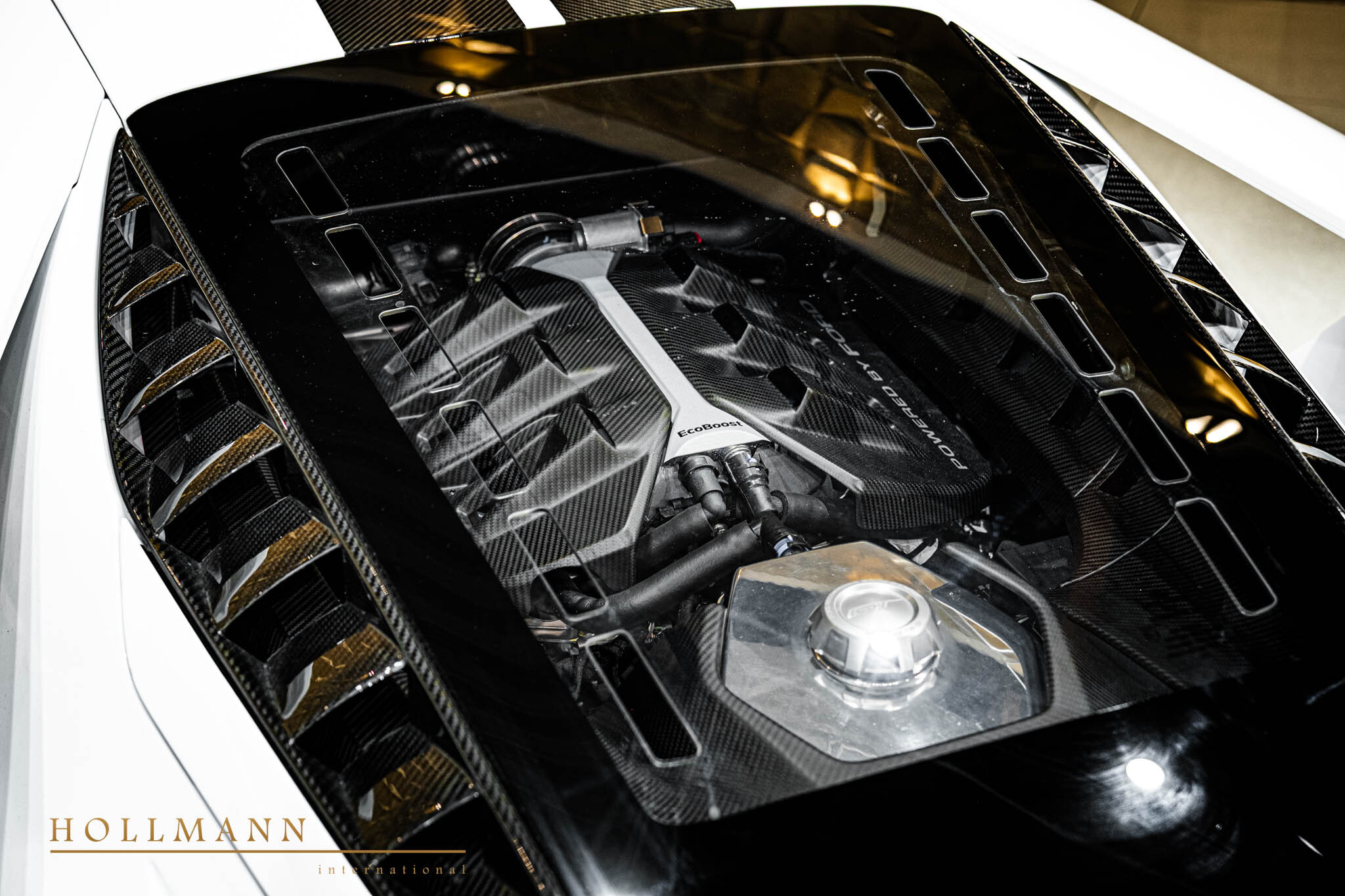 The exterior is specified in Frozen White, a clean, low-distraction finish that highlights the GT’s aero surfaces and flying-buttress architecture. This example leans heavily into exposed composite detailing. The options list confirms extensive carbon fibre content across the body: carbon fibre panels, carbon fibre doors and hood, carbon fibre fenders, carbon fibre front and rear fascias, a carbon fibre front splitter, and a carbon fibre rear diffuser and underbody. Aero shields in carbon fibre are also specified, aligning the car’s visual identity with its function. The wheel specification follows the same logic with 20-inch gloss carbon fibre wheels, complemented by titanium lug nuts. A lightweight titanium tow hook is listed, a small detail that reinforces the “built to be used” intent rather than a purely display-oriented build.