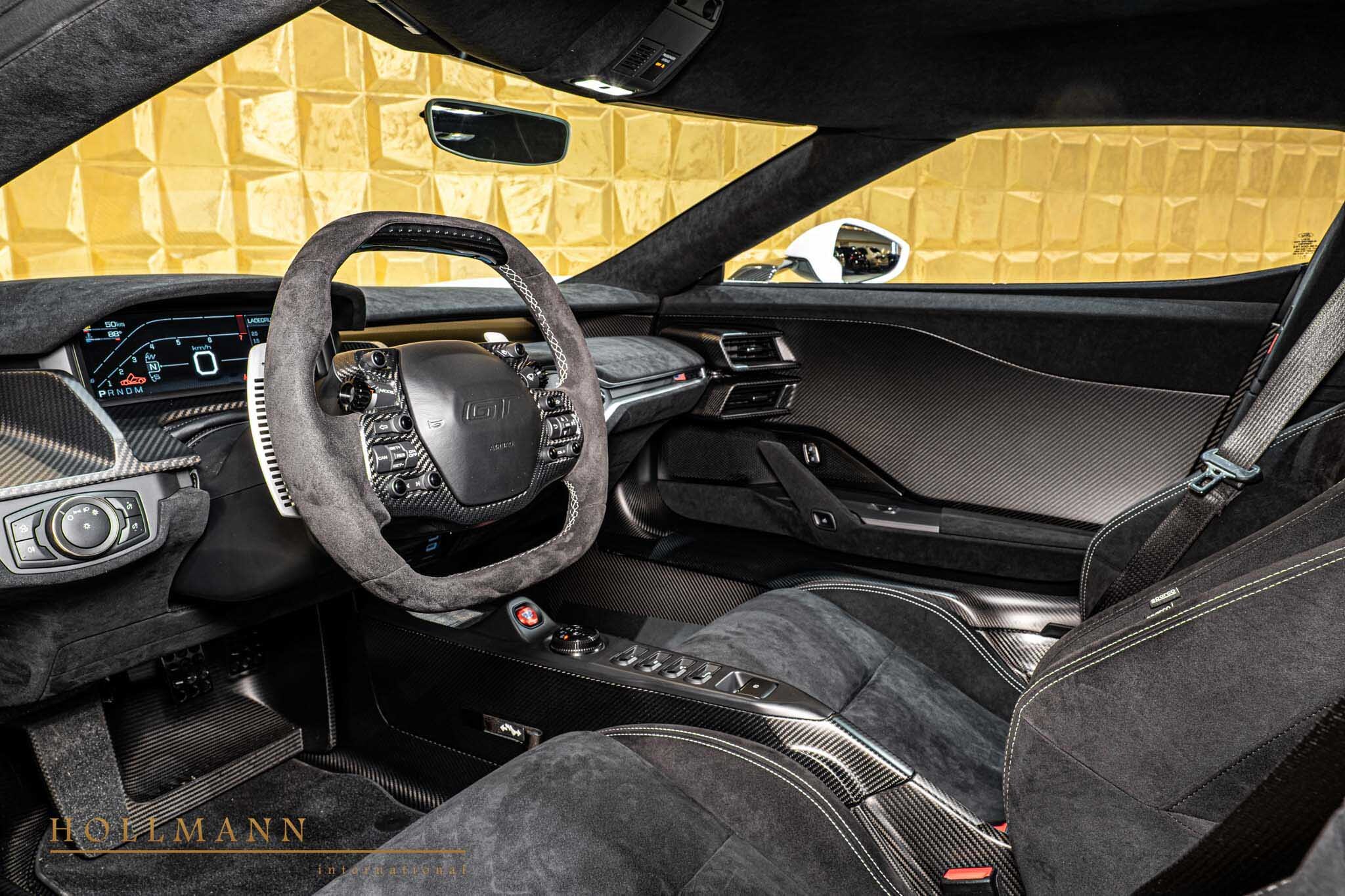 We are presenting this Ford GT for sale as an in-stock, delivery-mileage example offered for worldwide export. The listed figure is €894,500.00 net export, meaning the advertised price is tax-excluded in an export context. With 15 km indicated, a two-seat layout, and a black interior, this car is positioned as a near-new GT built around the same core idea that defines the model: lightweight structure, active aerodynamics, and a cabin designed around driving inputs rather than grand touring convenience.