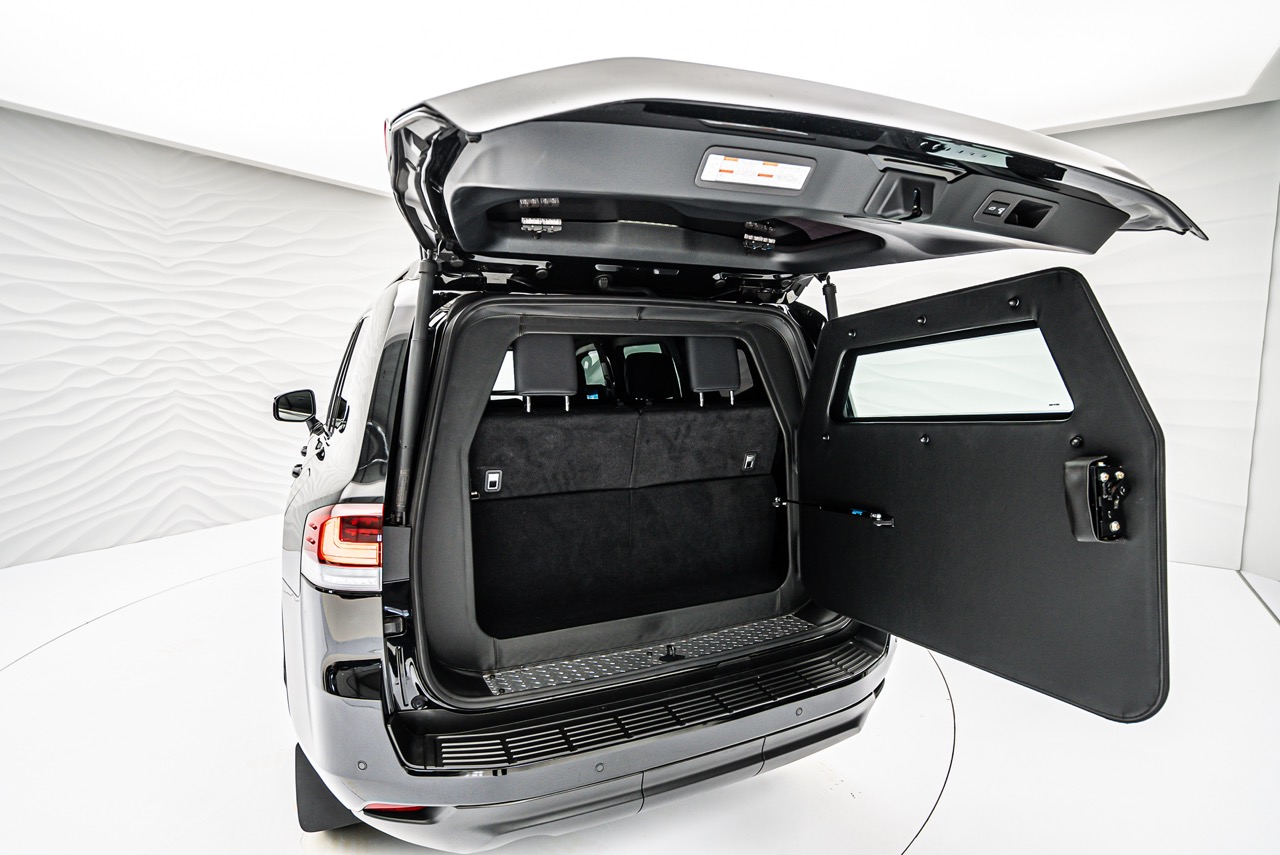 The exterior is finished in Attitude Black Metallic, a discreet color choice consistent with executive protection protocols. The cabin is upholstered in beige leather, creating a refined environment that contrasts with the vehicle's security-focused engineering. Factory equipment includes a 3D camera system for enhanced situational awareness, full LED lighting front and rear, four-zone climate control with air ionization, integrated navigation, cruise control, and memory settings for the driver's seat, steering column, and exterior mirrors across three positions.