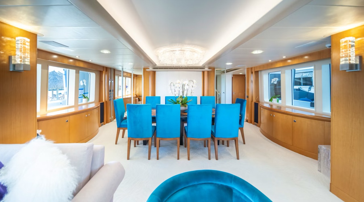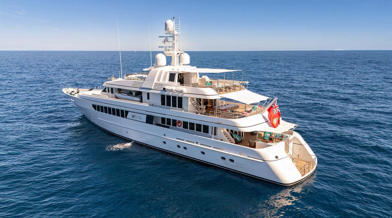 Feadship TASIA is offered for sale at $15,900,000 USD (approximately €13,435,341 EUR), a 158′2″ / 48.2 m steel-hulled yacht with a 28′7″ / 8.7 m beam and 10′2″ / 3.1 m draft. Built by Feadship in 1997 and recorded as refit 2024, TASIA is presented in turnkey condition following an extensive refit scope including new paint, engineering work, and a full interior update. She is powered by 2 x Caterpillar 3508 DITA engines and cruises at approximately 14.5 knots, with a 499 GT profile suited to transatlantic-style cruising. Accommodation is arranged for up to 12 guests across 5 cabins, supported by a professional 10-crew setup. Interior design is credited to John Munford Design, with exterior lines by De Voogt.