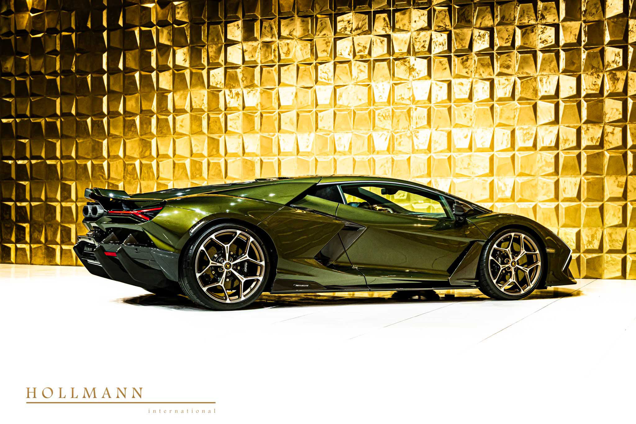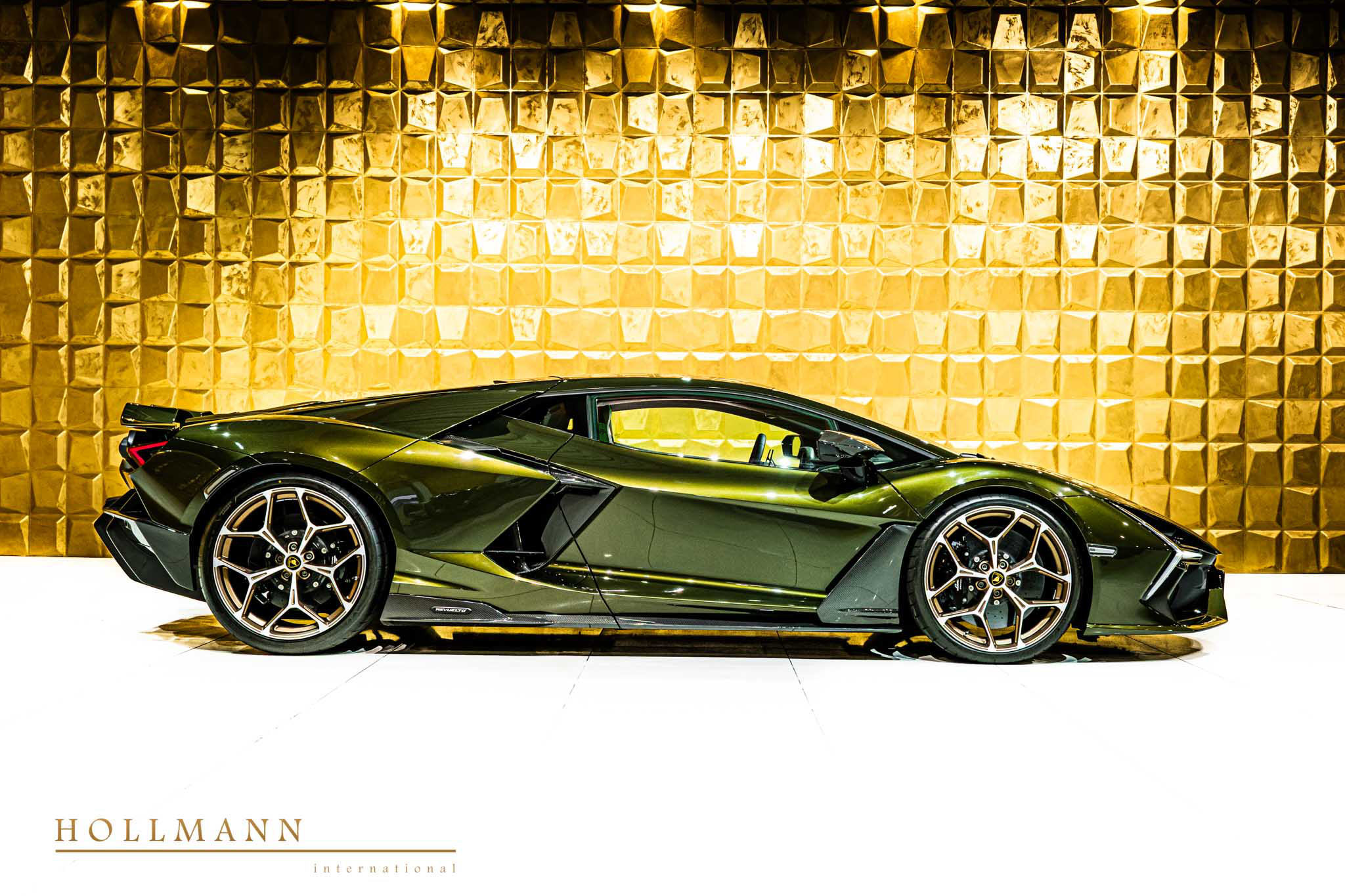 The exterior is finished in Verde Lares, a deep botanical green with depth across the Revuelto's sharply sculpted surfaces, scissor doors, and active aerodynamic architecture. The car rides on Altanero Bronze Diamond Cut forged wheels in 21-inch front and 22-inch rear configuration, a Corsa Tex fitment with bronze metallic finish that contrasts directly against the green bodywork. Engine grilles are coloured to specification, a Lamborghini rear logo is fitted, and the headlamps package completes the exterior commissioning. Carbon fibre kickplates in matt finish and an RB Pack round out the exterior and transition elements.