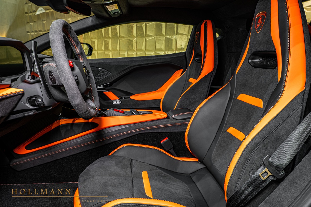 Carbon-ceramic brakes are fitted, complemented by Arancio Chiaro CCB brake calipers that introduce a chromatic continuity with the Arancio Apodis upholstery. Magneto Rheologic Suspension further reinforces the performance-focused configuration.