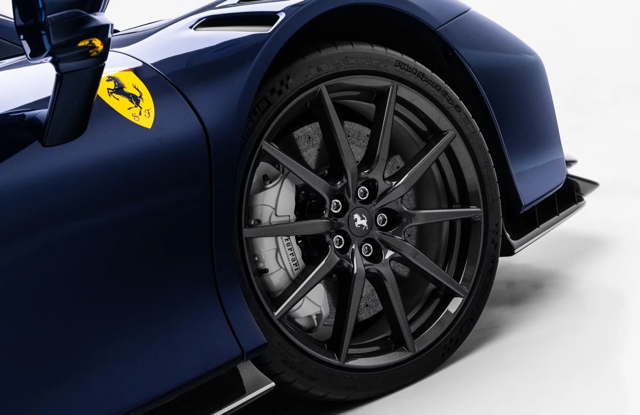 This example presents in Blue, a finish that highlights the SF90 XX Spider’s sculptural surfaces and exposed aerodynamic intent. The fixed rear wing, combined with revised front aerodynamic surfaces and reworked airflow management, defines the visual and functional identity of the XX Programme applied to a road-legal Ferrari.