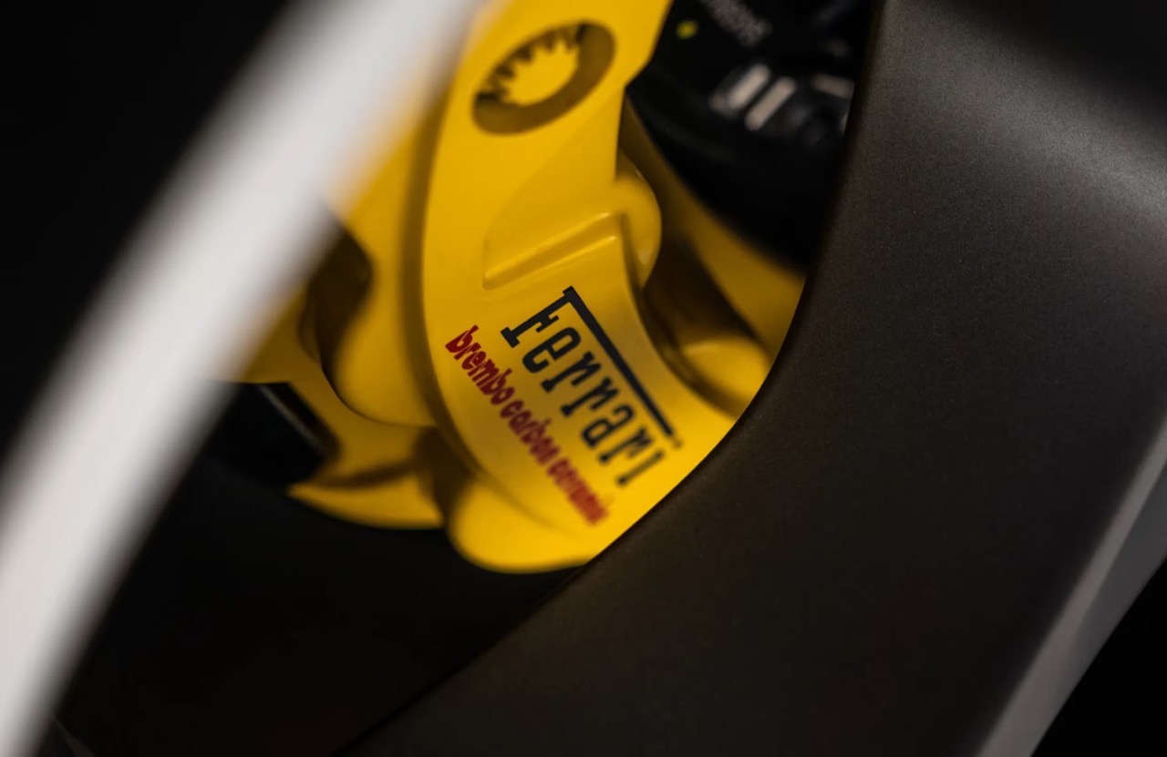 The cabin is finished in Nero Alcantara throughout, with Nuovo Giallo thread stitching establishing the colour connection to the exterior calipers. Cavallino embroidery on the headrests is a detail specific to this configuration, and the racing seat layout with large-size cushions reflects the driver-focused intent of the platform.