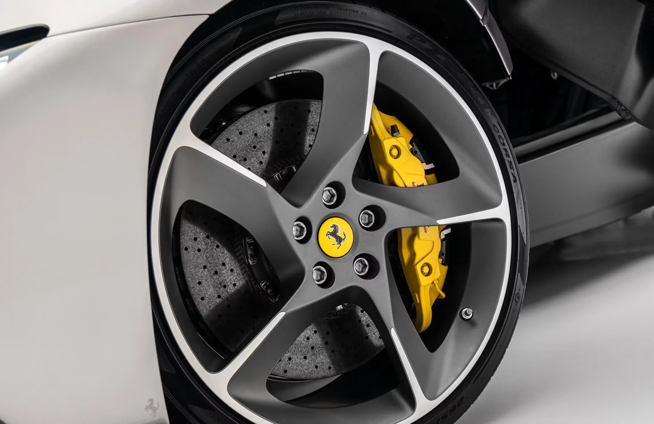 Carbon fibre is deployed on the lower body sections and outer mirrors, and airbrushed Scuderia Ferrari shields appear on the flanks. The diamond-polished forged wheels are paired with yellow brake calipers, introducing a precise contrast detail against the Aluminium exterior. An anti-stone chipping film is applied, and the black hardtop completes the exterior package.