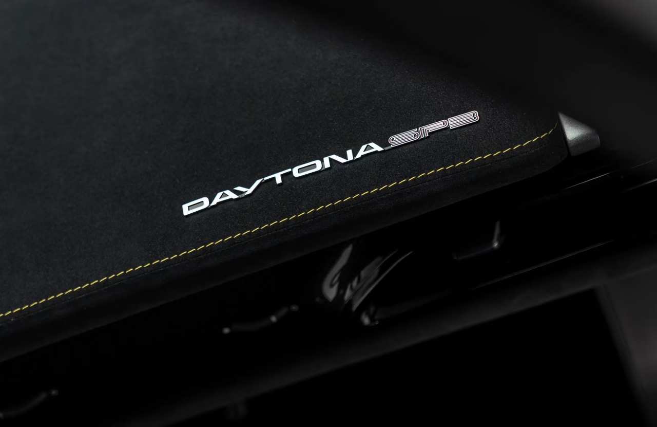 Four-point safety belts in black are fitted. Technology is present without excess: Apple CarPlay, front and rear parking cameras, and a suspension lifter address daily usability without altering the car's fundamental character. The suspension lifter in particular is a considered addition at this level, accommodating the Daytona SP3's low ride height in urban environments.
